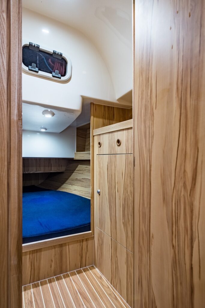 Wewnątrz: 3 zamykane, podwójne koje. Kambuz z lodówką i kuchenką, ogrzewanie, kabina WC.